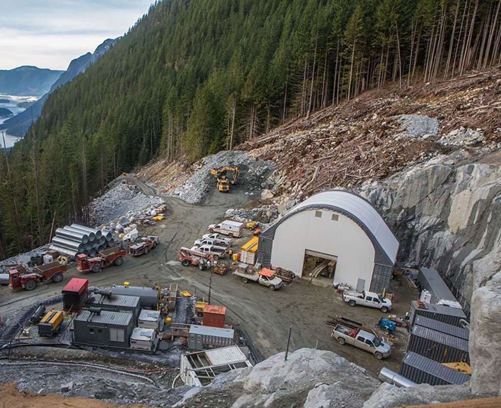 CanMine provided a full-service design-build package including labour, equipment, materials, and site infrastructure for this greenfield site. The private power hydroelectric project consisted of over 1,800m of underground workings for conveyance of water from a mountain top lake reservoir to a surface penstock pipe. CanMine’s scope included the excavation of 1,223m of lower tunnel using mechanized drill & blast techniques, 528m of Alimak raise, 68m of conventionally driven sub-drift, a lake tap blast, and supporting underground civil and mechanical construction.